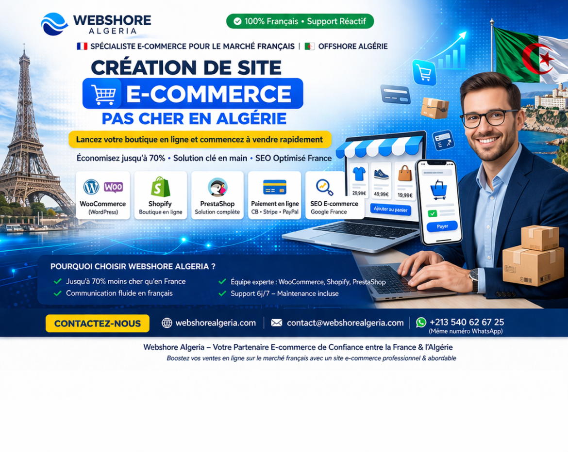Le e-commerce connaît une croissance massive en France. Cependant, créer une boutique en ligne professionnelle peut coûter cher. C’est pourquoi de nombreuses entreprises françaises choisissent aujourd’hui de développer leur site e-commerce en Algérie.